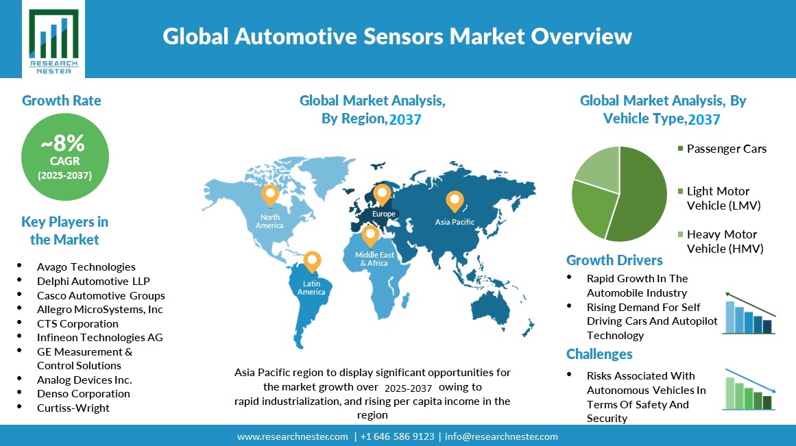 世界の自動車用センサー市場は、2025年から2037年の予測期間にわたって約8%のCAGRで成長し、2037年末までに大きな収益を獲得すると推定されています。さらに、市場は2024年にわずかな収益を生み出しました。 市場は、車両タイプ別に、乗用車、軽自動車(LMV)、大型自動車(HMV)に区分されています。これらのうち、乗用車セグメントは、世界的な自動車需要の高まりと乗用車の供給増加を背景に、2031年末までに最大の収益を獲得すると予想されています。