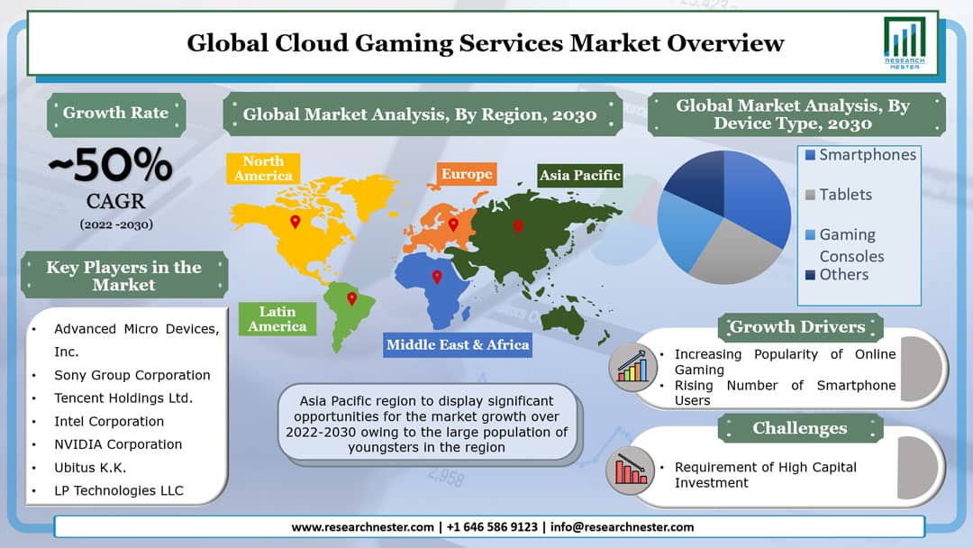 世界のクラウドゲーミングサービス市場は、クラウドゲーミングプラットフォームの人気の高まり、若者のゲーミングへの関心の高まり、そしてスマートフォンの入手しやすさを背景に、成長すると予測されています。デジタル化の進展とインターネットの普及は、市場の成長をさらに加速させると予測されています。クラウドゲームは、ライブゲームとデジタルゲームの次世代であり、世界中で急速に普及しており、プラットフォームとサービスの需要が急増しています。これらの要因が市場の成長を後押しすると予測されています。